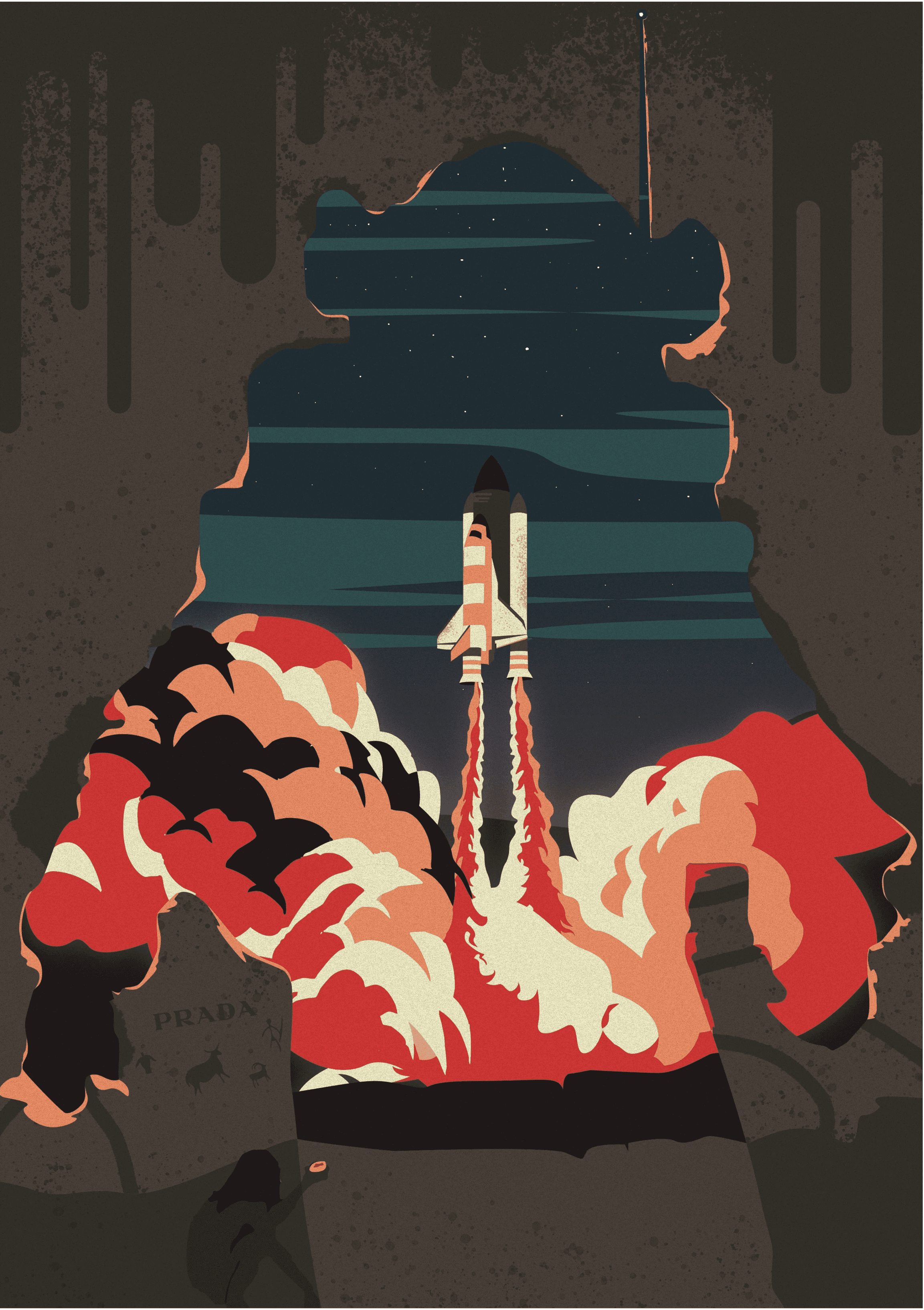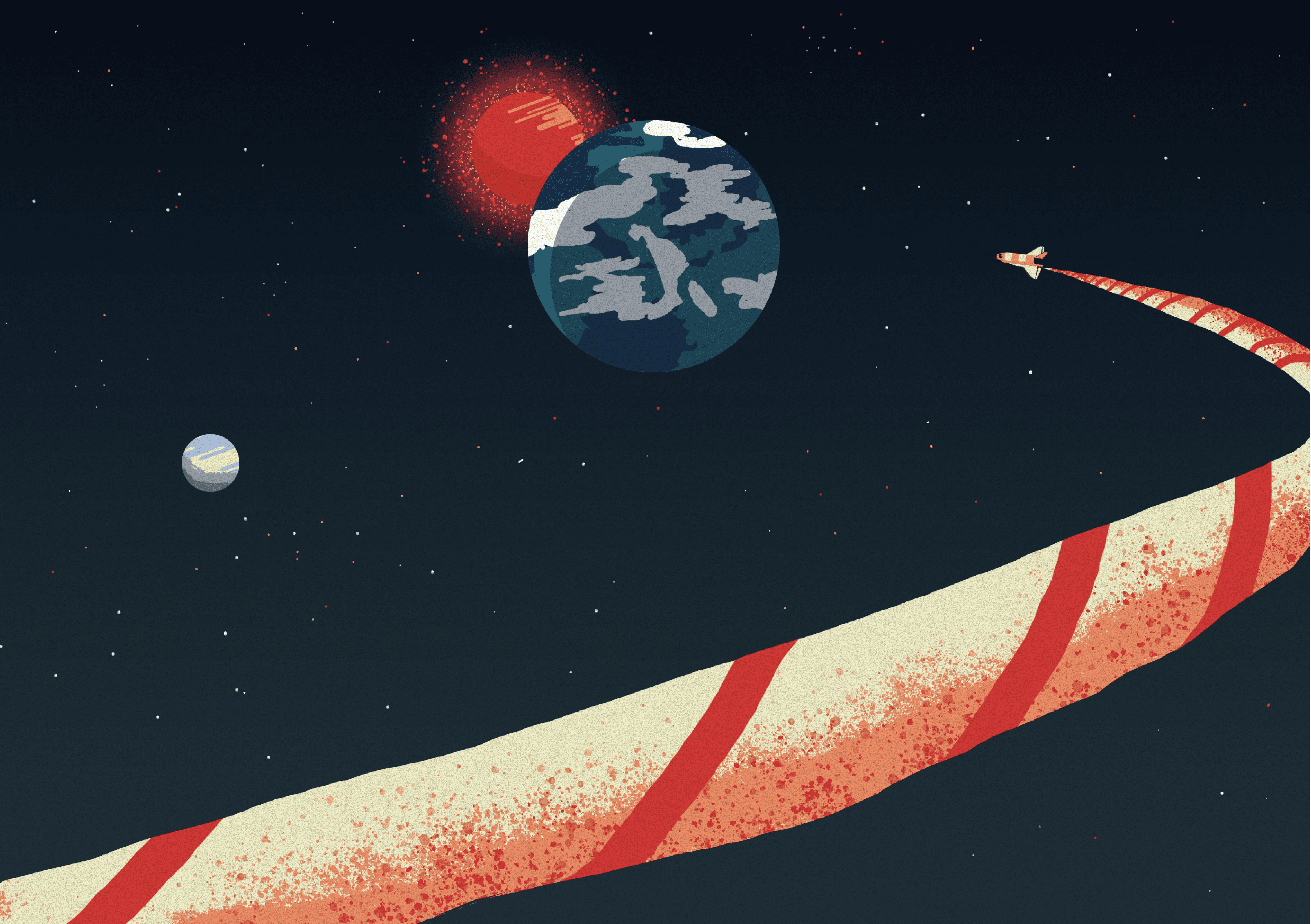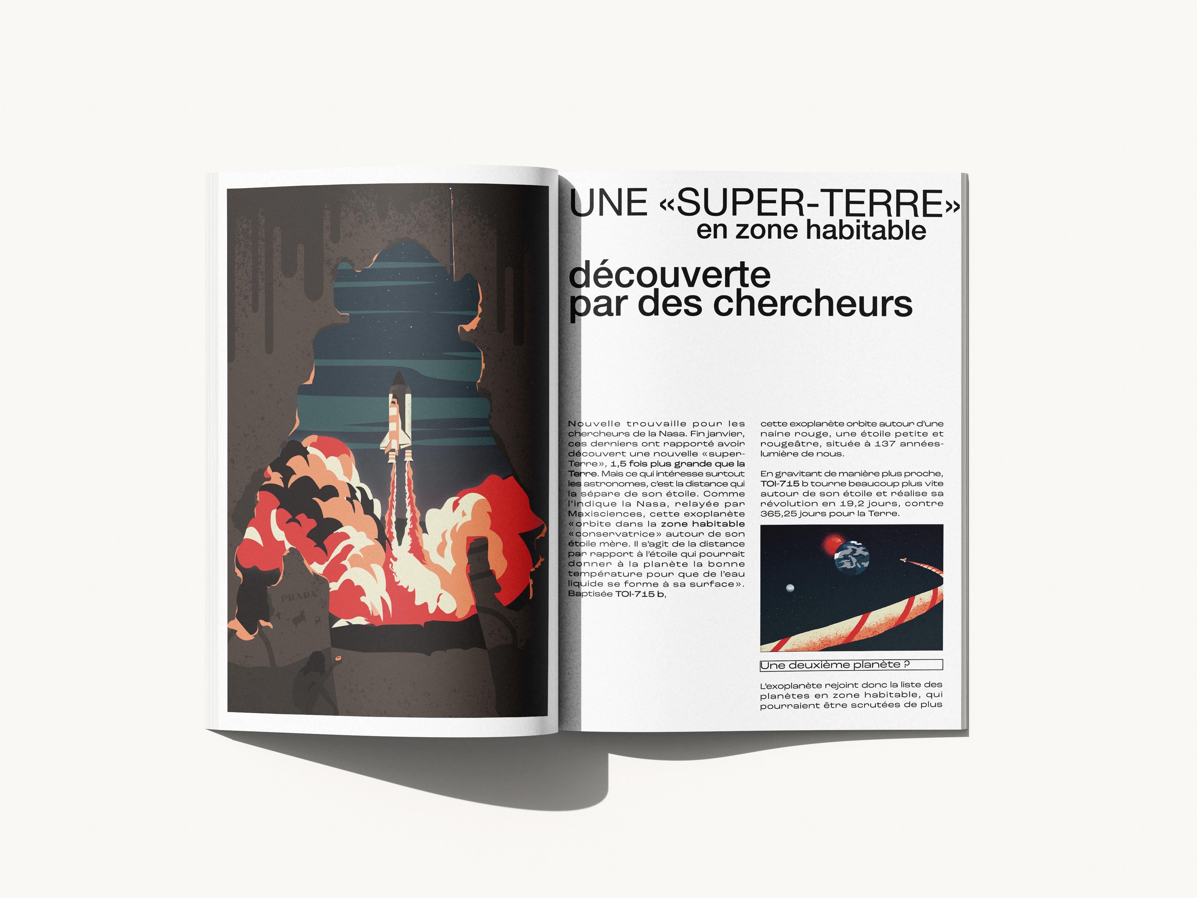 Série d’illustrations éditoriales, Le travail visuel met en scène la découverte des enjeux scientifiques, humains et imaginaires liés à l’exploration d’un nouveau monde et le départ du nôtre.